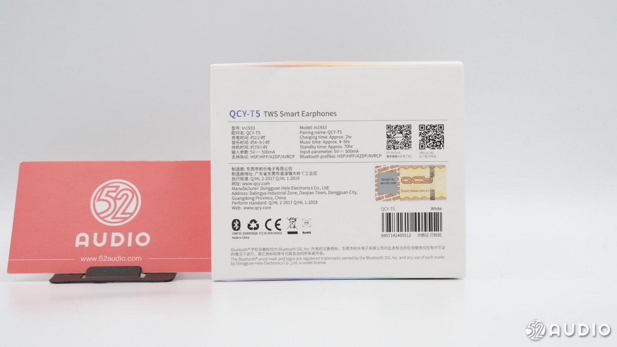 包裝盒背面是一組中英文對照的產品信息,主要內容有:QCY T5 TWS藍牙耳機,型號In1933,音樂播放時間約4-5小時,輸入參數5V?500mA,支持協議:HSP/HFP/A2DP/AVRCP,制造商:東莞市和樂電子有限公司。此外還有一些認證信息和防偽查詢信息等。
