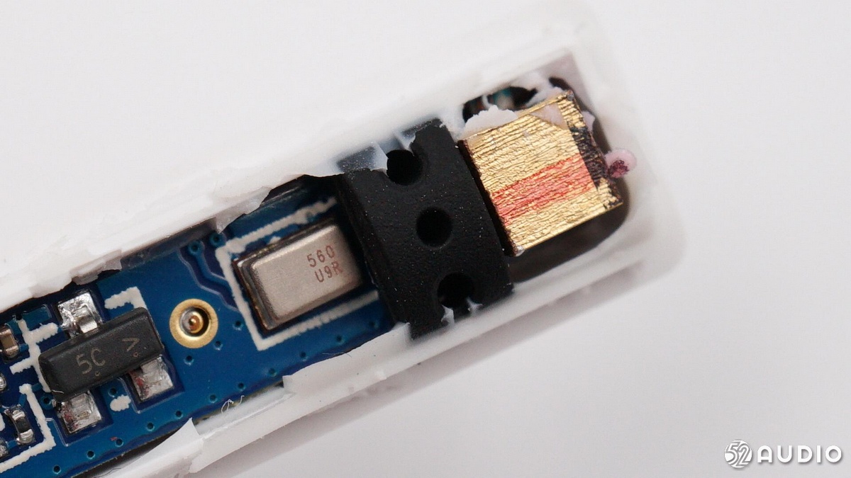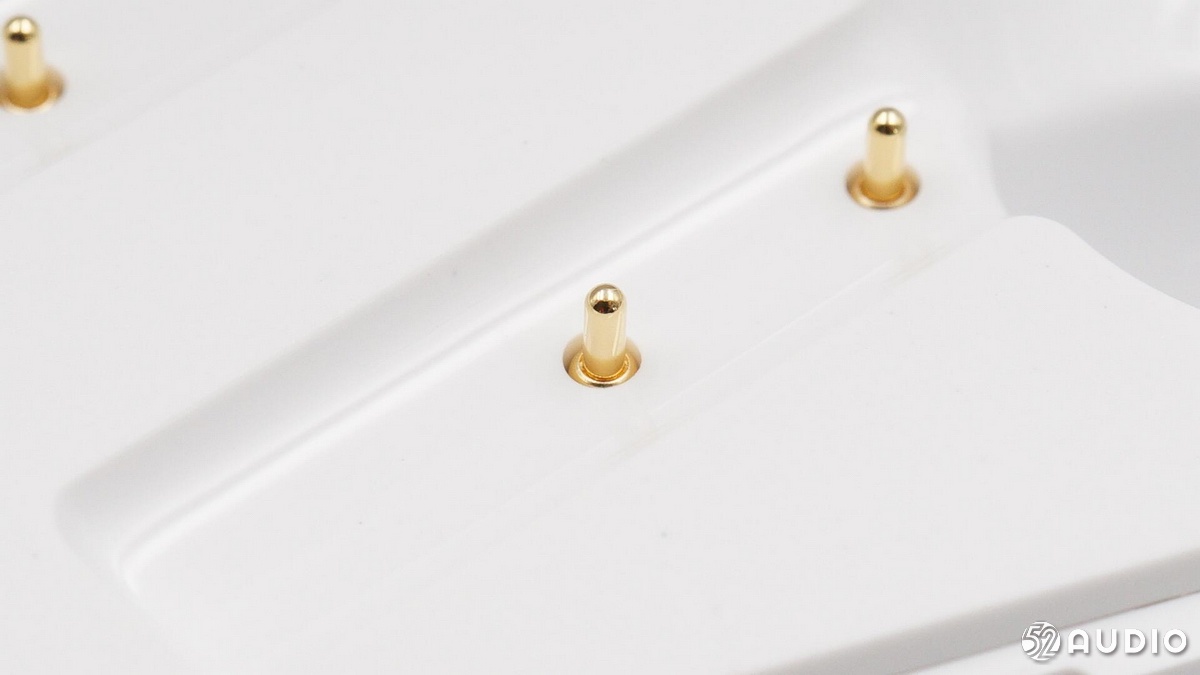 充電銅柱特寫。與充電盒的頂針接觸后,充電盒電池就會給耳機電池供電,銅柱上有密封圈,防止液體進入。