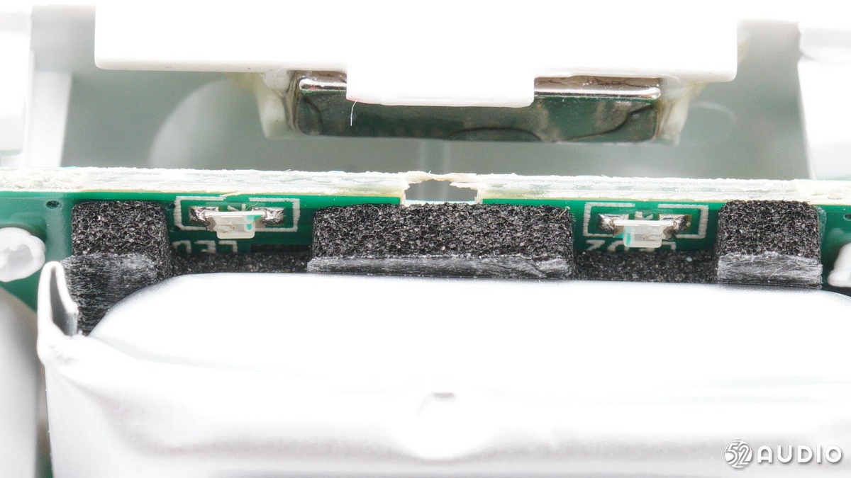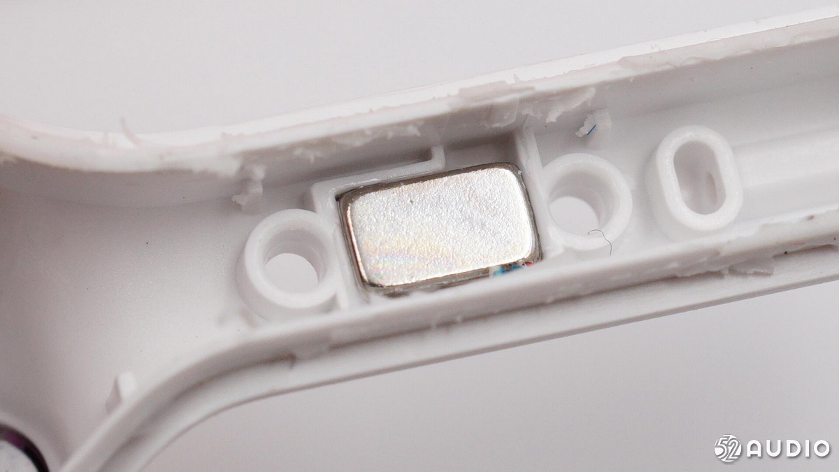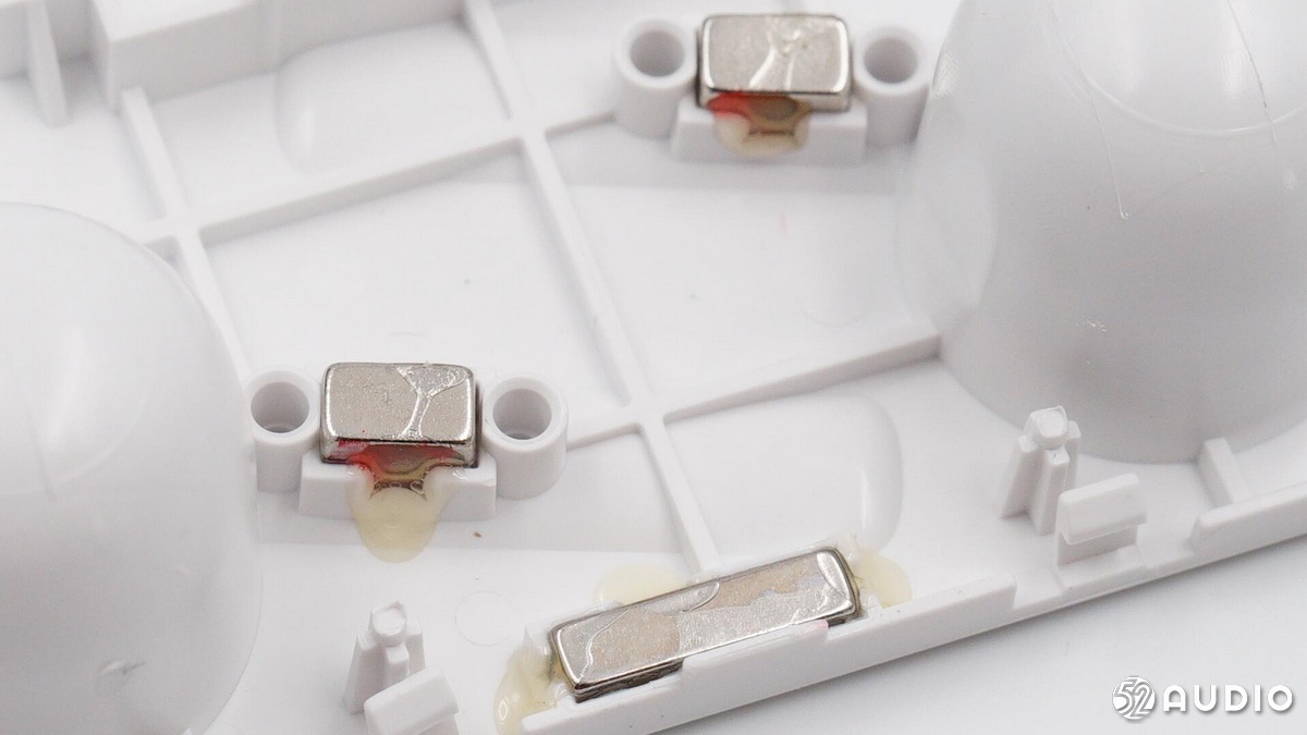 充電座艙內側的三塊磁鐵,兩塊小的用于固定耳機,一塊大的用于吸附充電盒蓋。