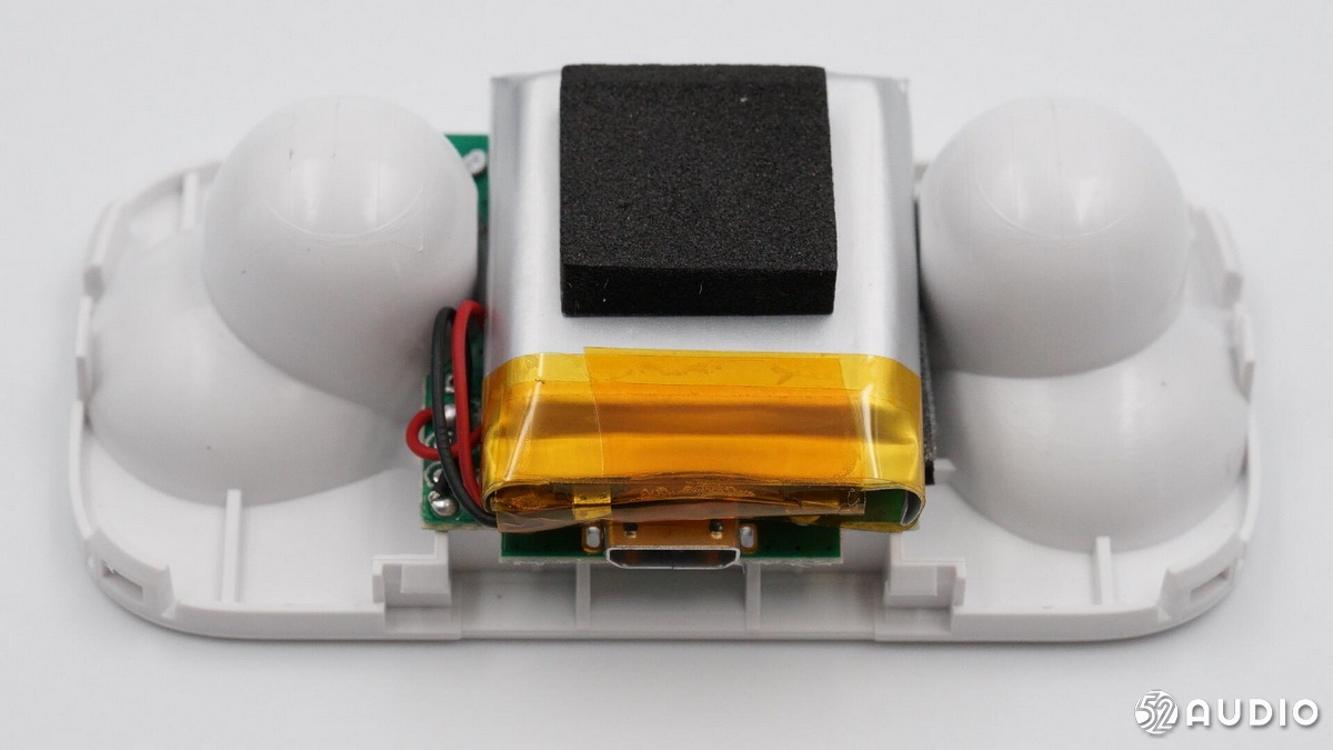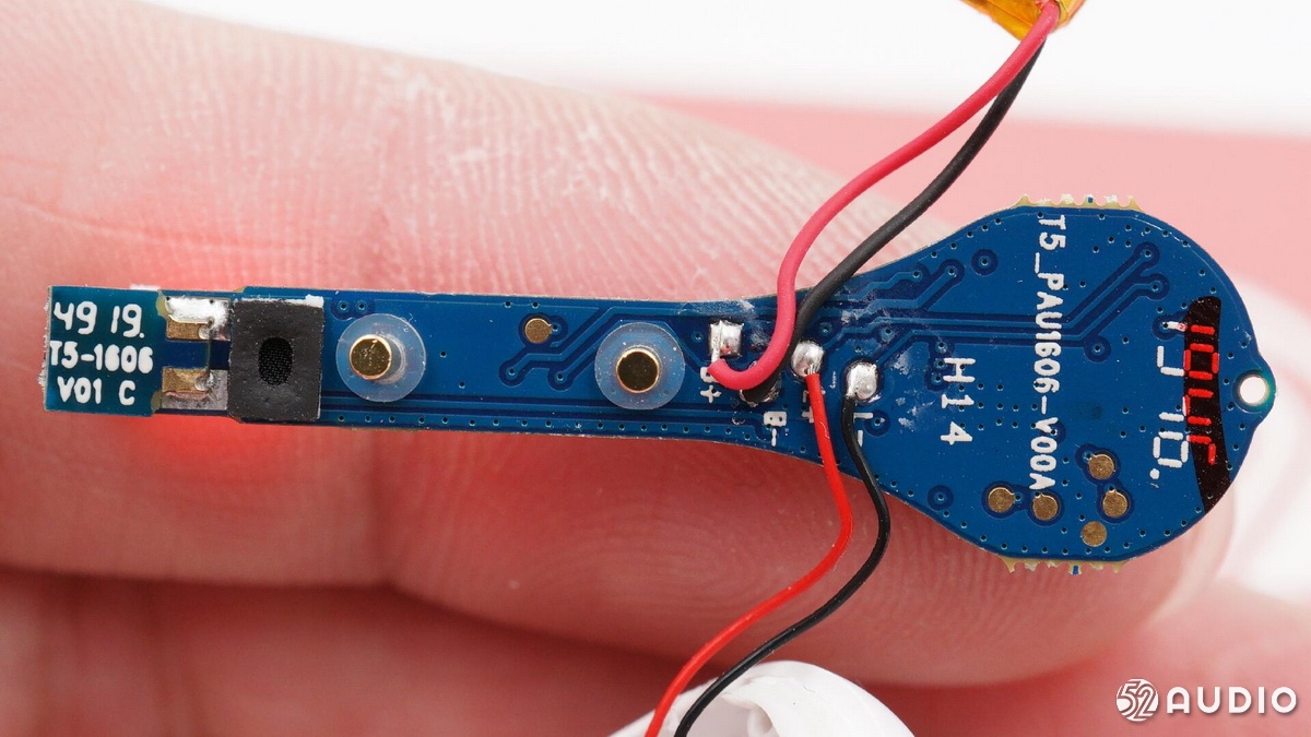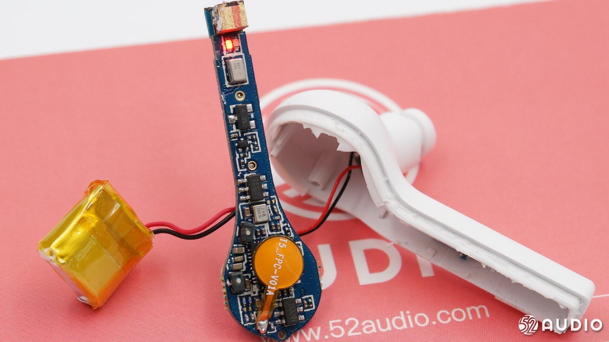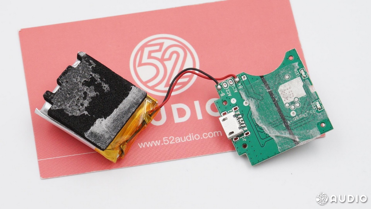 耳機內部電路一覽,電池和揚聲器通過導線連接至主板。