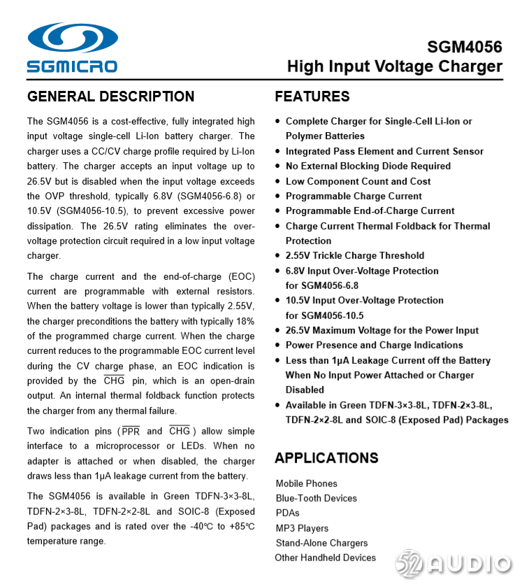 圣邦威SGM4056 線性充電IC,內置過壓保護,最高耐壓26.5V,并且有6.8V過壓保護,可以省去外部過壓保護元件。