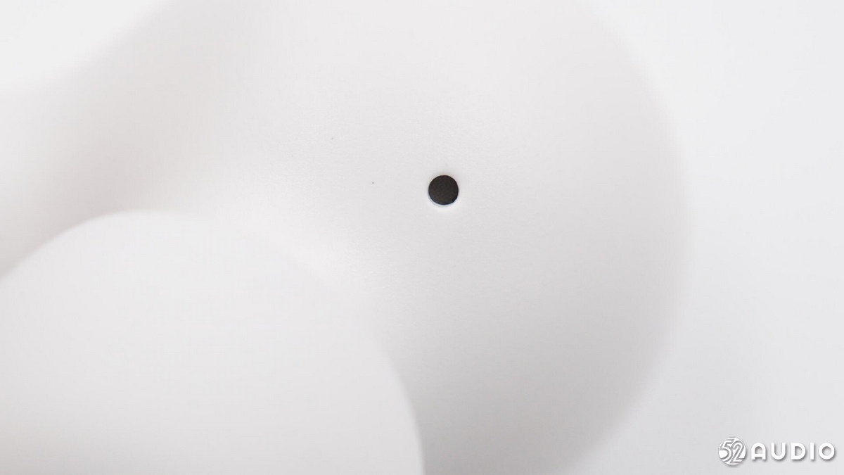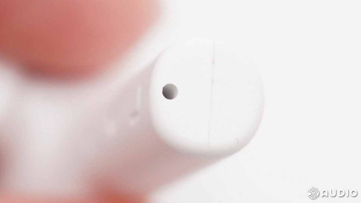 耳機柄底部特寫,依次是麥克風、指示燈保護罩和藍牙天線。