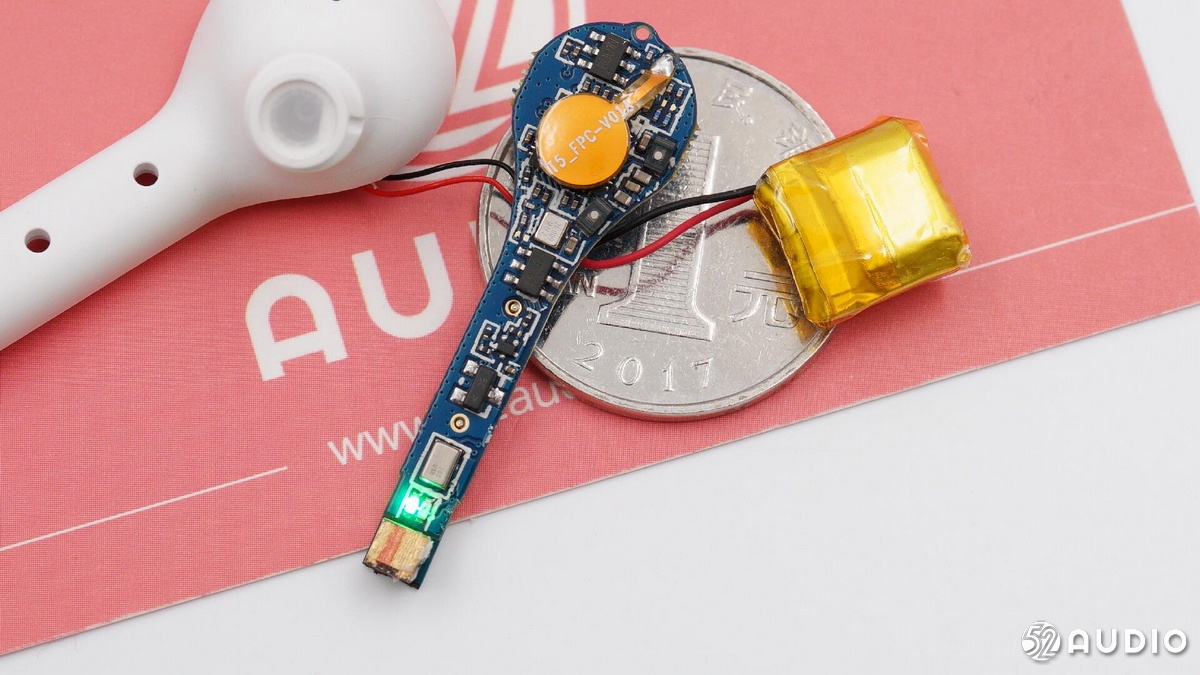 耳機主板和軟包電池與一元硬幣的尺寸對比。