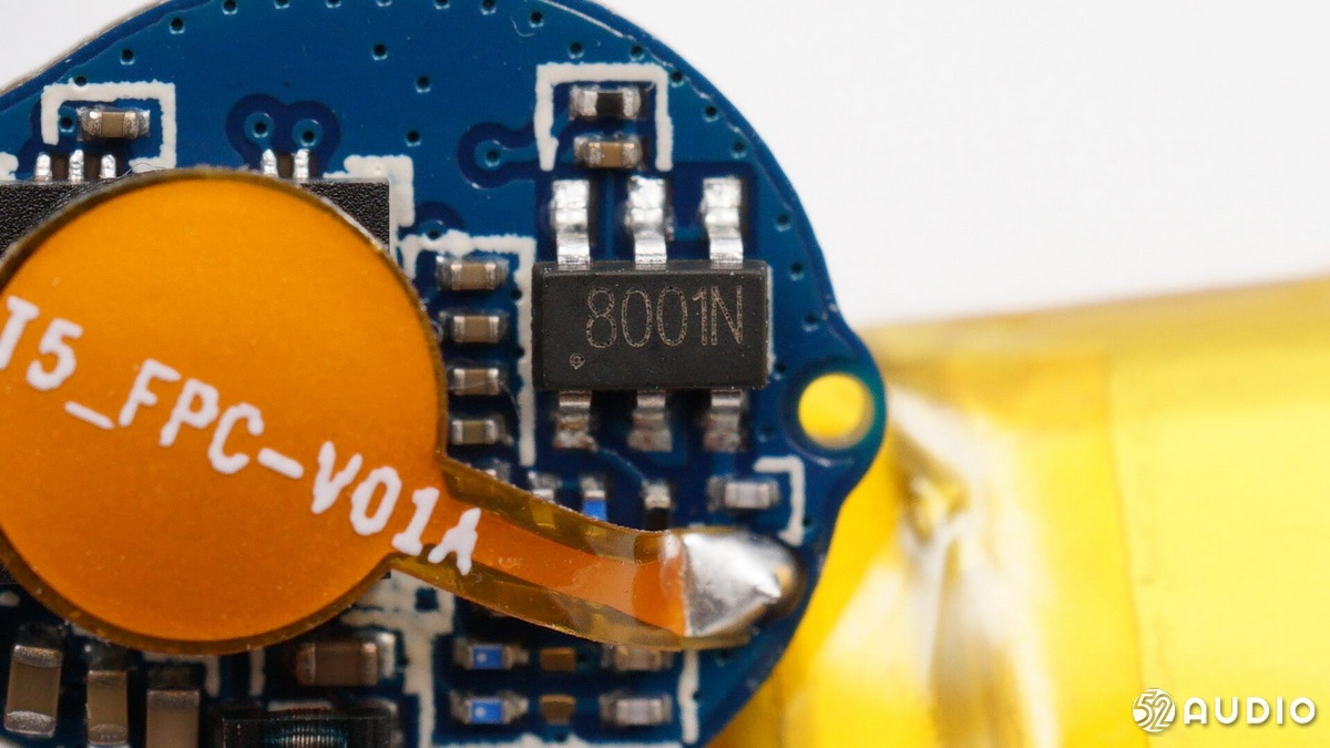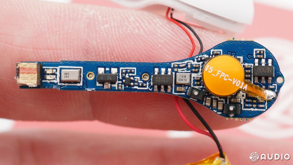 耳機部分,QCY T5 與T4一樣采用了原相 PAU1606FB-S1藍牙音頻SoC,支持藍牙5.0,其GeendRadio?立體聲技術,具有左右耳快速切換、低延遲的特點,被很多“游戲TWS”耳機采用。并且該芯片內置鋰離子電池充電器,確保耳機電池的充電安全;耳機內的軟包電池容量為43mAh,與T4一樣。耳機采用疊層貼片藍牙天線收發藍牙信號。
