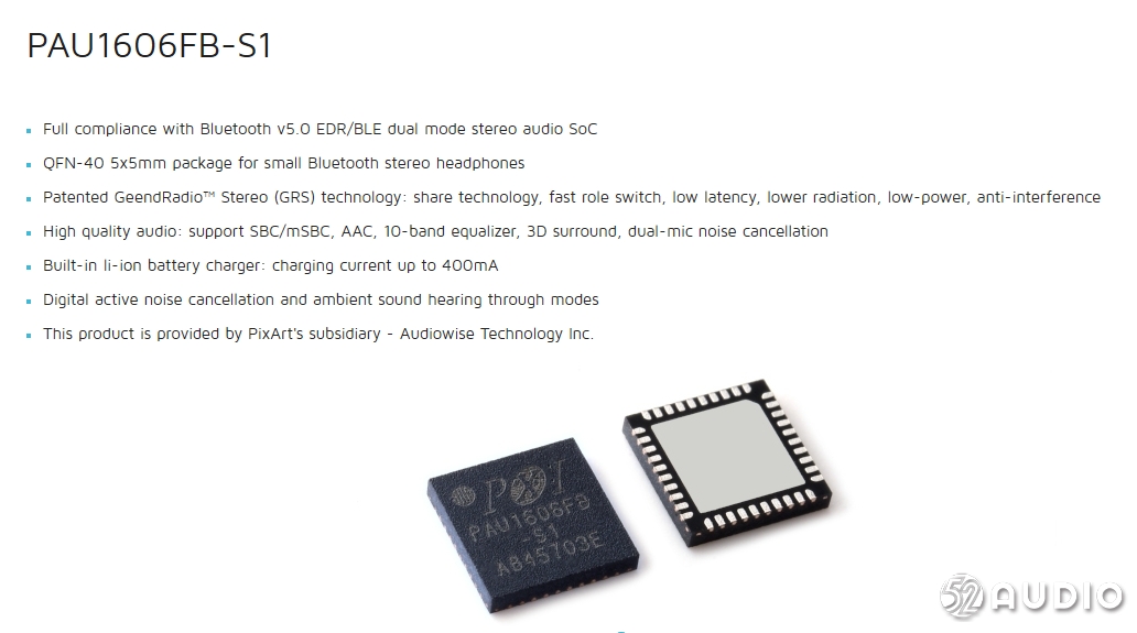 主控芯片為PixArt原相 PAU1606FB-S1,支持藍牙5.0 EDR / BLE雙模,采用QFN-40 5x5mm封裝,適用于TWS耳機。