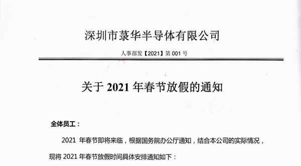 2021年春節即將來臨,根據國務院辦公廳通知,結合本公司的實際情況,我司2021年春節放假時間具體安排通知如下:2月7日至2月17日放假調休,共11天;2月18日(初七)正常上班。